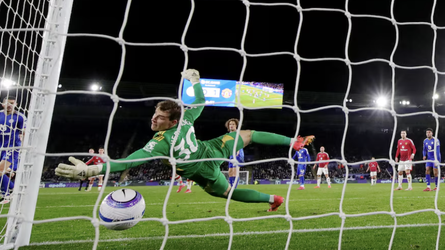 Leicester-keeper Mads Hermansen skulle plukke et løst framspill fra Ruben Dias, men Wout Faes kom i veien for ham, og han glapp ballen rett til Marmoush.