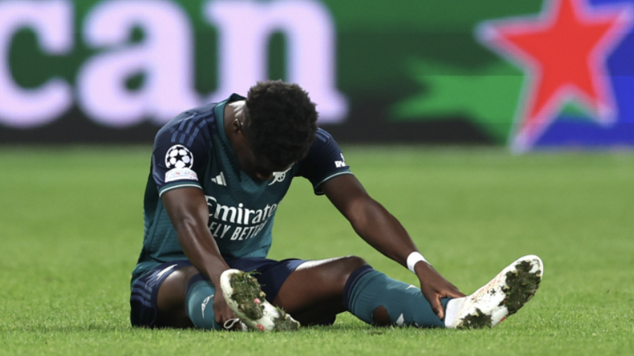 Arsenal-stjernen Bukayo Saka måtte ut med skade i Arsenals Champions League-tap i Frankrike tirsdag.